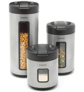 Cuisinart 3-Piece Storage Canister Set The Cuisinart 3pc Canister Set-includes a 2-, 3-, and 4-quart canister to hold dry food items. The clear window attractively displays contents and a convenient sliding section in lid reveals spout for easy pouring. Read more